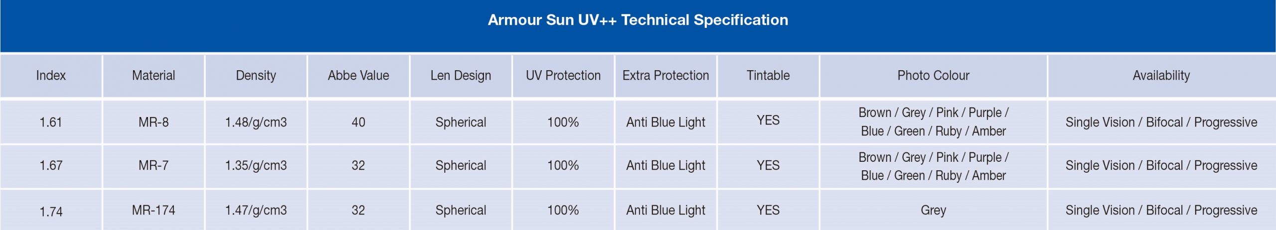 Armour Sun effectively absorbs high-energy blue light generated from digital electronic devices. Armour Sun lens is highly sensitive. It is colorless transparent indoor and changes according to the UV strength outdoor. The stronger UV color, the darker lens color is. Light transmittance will increase quickly when coming back indoor from outdoor.