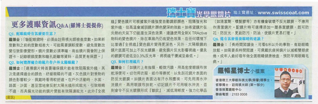 蘋果日報- 世界視覺日專題: 全天候保護你雙眼由認識鏡片開始