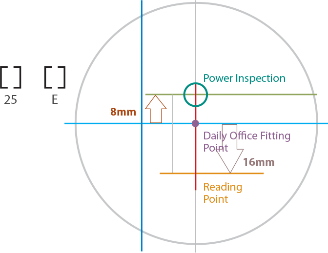 • Fitting cross: Center point of engraving axis • Minimum vertical frame size: 26mm • Fitting height: 16mm • Minimum 10mm from the fitting cross to the top of the inner frame • Ordering with progressive prescription • Degression power automatically be calculated by program • Choice for intermediate vision distance: from 65cm to 4m (5cm per step) on eye level